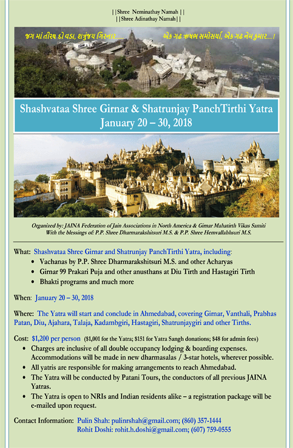 JAINA is organizing Girnar Yatra from January 20-30, 2018. Details are below.